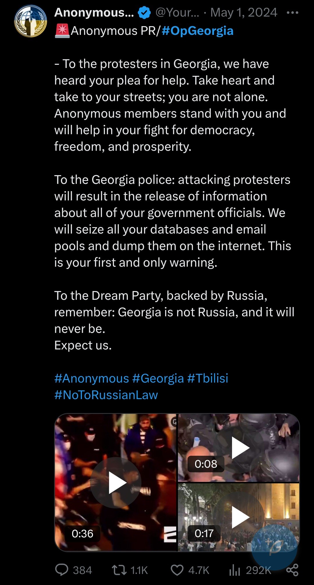 მაგალითად, რუსეთ-უკრაინის ომის დროს Anonimus-მა რამდენჯერმე გატეხა და მოიპოვა რუსული გასაიდუმლოვებული ინფორმაცია, რომელიც უკრაინულ დაზვერვას გადასცა. ასევე, გამოეხმაურა საქართველოში მიმდინარე პროცესებს: „საქართველოს აქციის მონაწილეებო, მოვისმიენთ თქვენი თხოვნა დახმარებაასსთან დაკავშირებით. გული გაიმაგრეთ და გადით ქუჩაში. თქვენ მარტო არ ხართ, Anonimus-ის წევრები თქვენს გვერდით დგანან და დაგეხმარებიან დემოკრატიის, თავისუფლებისა და კეთილდღეობისთვის ბრძოლაში“. მიმართა საქართველოს პოლიციას: „აქციის მონაწილეებზე თავდასხმა გამოიწვევს ინფორმაციის გავრცელებას თქვენი ხელისუფლების ყველა ოფიციალური პირის შესახებ. ჩვენ ხელში ჩავიგდებთ თქვენს ყველა მონაცმეთა ბაზას, ელექტრონული ფოსტის მასალას და მათ ინტერნეტში გავავრცელებთ ოცნების პარტიას, რომელსაც რუსეთი მხარს უჭერს. გახსოვდეთ, საქართველო რუსეთი არ არის და არც არასდროს იქნება, გველოდეთ“. მათ მიერ გაკეთებულმა ამ განცხადებამ იმ ქართველი ხალხის დიდი მხარდაჭერა გამოიწვა, რომლიც არ აღიარებს ქართული ოცნების ხელისუფლებას. აქედან გამომდინარე კი დასკვნის გამოტანა თქვენთვის მომინდია მკითხველო, განა ყველა ნაყოფი გამოუსადეგარია?